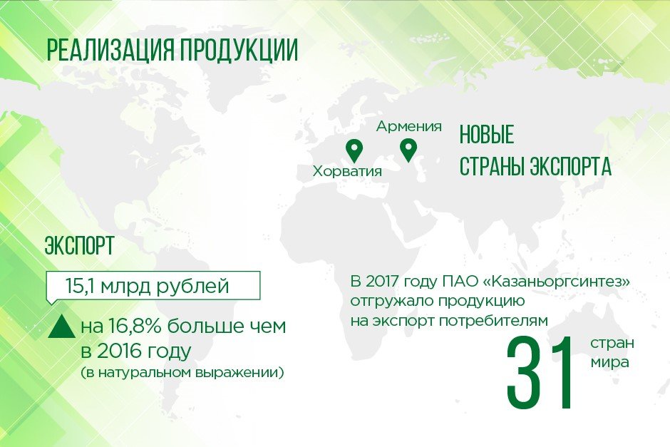 На внутреннем рынке «Казаньоргсинтез» реализовал товары на сумму 56,9 млрд рублей, что на 8,2% меньше, чем в 2016 году. Продажи на экспорт в прошлом году возросли на 12,5%. За границу было продано продукции на сумму 15,1 млрд рублей. Экспортные поставки в первую очередь были ориентированы на страны с более высоким уровнем контрактных цен. В прошлом году товары нефтехимического предприятия поступили на рынки 31 страны мира. Новыми потребителями продукции «Казаньоргсинтеза» стали Хорватия и Армения. Также возобновились поставки в Грузию.