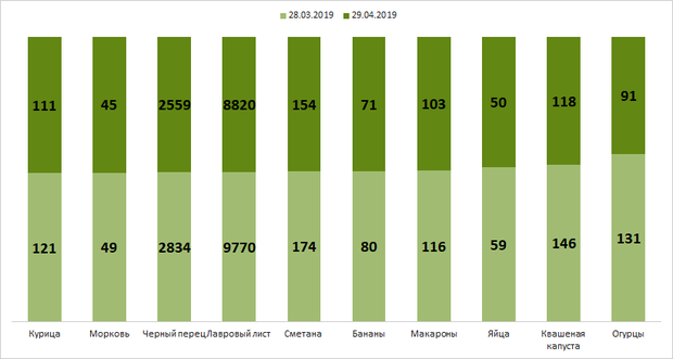 Что касается подешевевших товаров, то более чем на 10% уменьшились цены на шесть видов продуктов. Рекорд снижения стоимости — у огурцов. Они стали доступнее сразу на 30%. Второе по величине уменьшение цены — на квашеную капусту, она подешевела на 19%. Также ощутимо снизилась стоимость яиц — сразу на 16%. Напомним, они резко подскочили в цене еще в конце 2018 года, производители тогда связывали это с ростом цен на зерно. Среди продуктов, подешевевших примерно на 11%, — макароны, бананы и сметана. Примерно на столько же снизилась стоимость моркови, двух видов специй и мяса курицы. Помимо этого, заметно небольшое уменьшение цены сахара, сливочного масла, сыра, говядины и картофеля (на 3—5%).