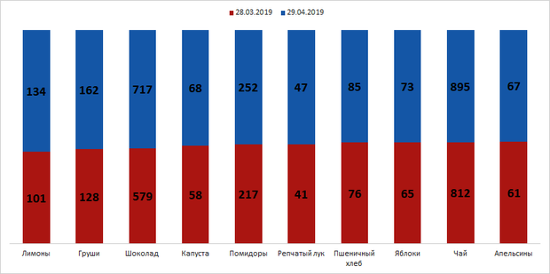 В апреле большая часть продуктов — 25 наименований — снизились в цене. Увеличилась стоимость только 18 видов продовольствия. Впрочем, при этом сильно подорожавших товаров оказалось больше, чем подешевевших: более чем на 15% выросла цена сразу пяти продуктов, а подешевели на ту же величину лишь три. Рекорды роста ставят некоторые виды фруктов и овощей.