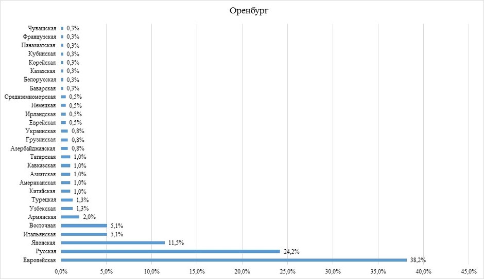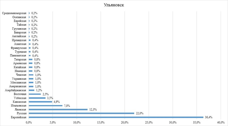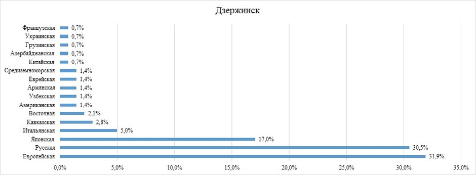 Всего в автограде можно распробовать блюда кухонь 25 народов мира, но 16 из них — всего в 3-7 заведениях города, составляющих 1 и менее процента от всего рынка. Что интересно, в десятке лидеров в автограде, помимо очевидно популярных американской (2% — 14 заведений) и узбекской (2,6% — 18 заведений) кухонь, находится также кавказская кухня (3% — 21 заведений).