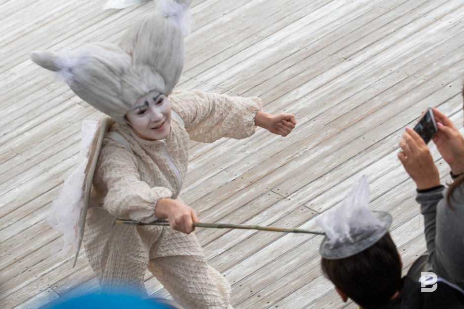 Отдельная история — дети. Груднички в колясках — надо же, ни один не заплакал. Зрители трех-четырех лет от роду, некоторые из них неожиданно выскакивали в сценическое пространство, но, удивительно, не мешали никому. Часть публики пришла со своими пледами — вечер был нетеплый. Пахло кофе — многие пили его из бумажных стаканчиков. Пару раз раздавался приветственный собачий лай — в это время на Черном озере часто выгуливают питомцев.