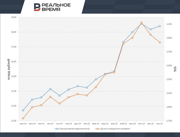Татарстанские банки показали в своей отчетности на 1 сентября просроченную задолженность на сумму свыше 18,4 млрд рублей. Для сравнения, именно столько составляло прогнозное значение доходной части бюджета Казани на 2015 год. Еще в начале года просрочка составляла лишь 14,2 млрд рублей или 3,1% от совокупного кредитного портфеля банков РТ. В августе доля «плохих» долгов составила 3,8%.