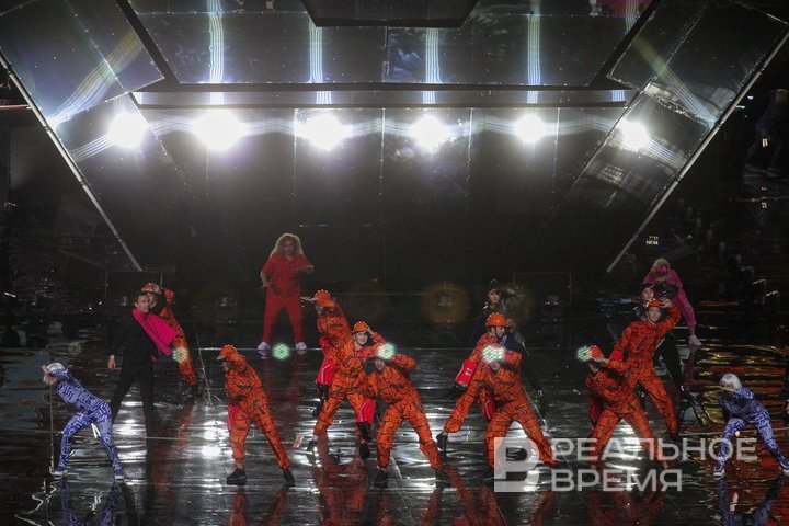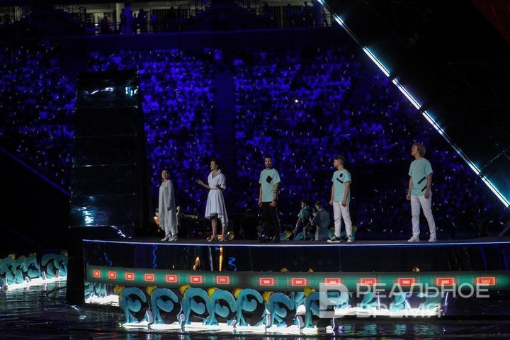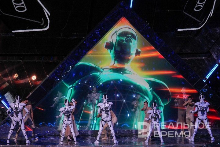 Вдруг с пирамиды опустились голубые полотна занавеса, и на большой сцене перед зрителями открылась живая пестрая река из флагов разных стран и танцующих людей. Певцы на высоком крутящемся подиуме, читая рэп, произносили названия стран — участниц чемпионата. Отдельной фишкой приветственного танца стало то, что хореографы умудрились встроить в него движения, характерные для каждой из представленных стран. Вроде бы почти незаметная мелочь и вряд ли многие это заметили — но сколько же труда и искусства в это вложено!