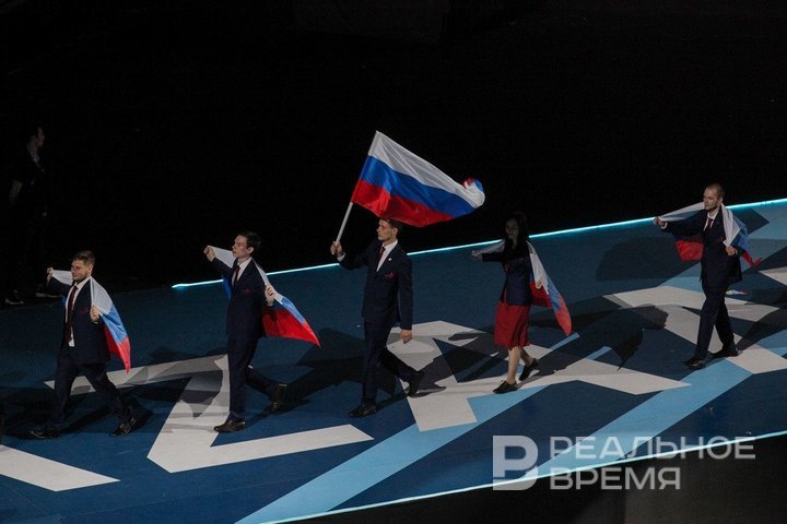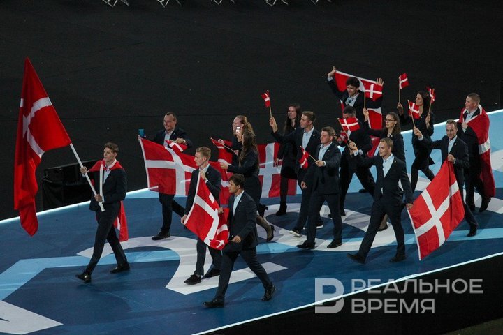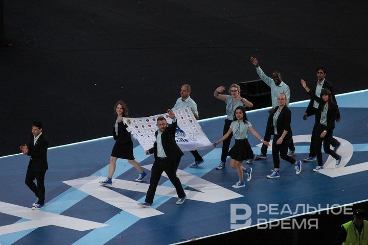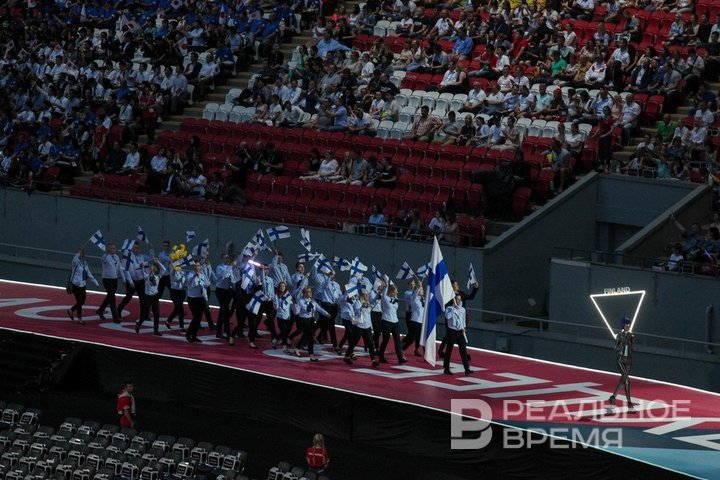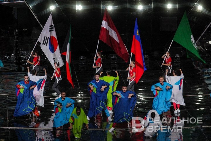 Первыми на подиум невероятных размеров вышли председатель правительства РФ Дмитрий Медведев и президент WorldSkills International Саймон Бартли. А потом началась одна из самых ярких частей церемонии — парад участников соревнований. 1 300 участников соревнований из 63 стран и регионов прошли по арене под своими флагами. Отдельно от своей страны выступила команда австрийского Тироля, а Китай представил целых четыре делегации: собственно, из КНР, из Гонконга, из Макао и из Тайбэя.