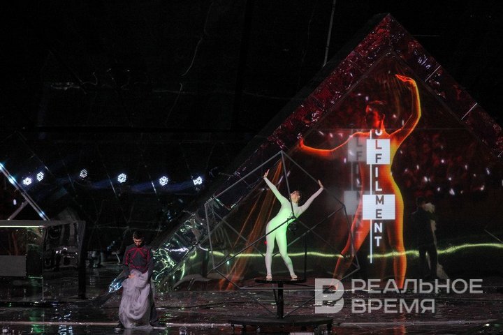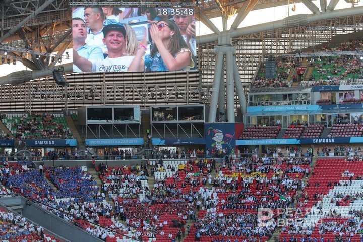 В центре арены стоит гигантская перевернутая пирамида, символизирующая раскрытые вверх руки: в нее вмонтирована сцена. Здесь и проходит основное действо. На четырех экранах стадиона замелькали года и города проведения мирового чемпионата по профессиональному мастерству по стандартам WorldSkills. Появился видеоролик о ремеслах. Мастера вышивали, плели ковры, расписывали посуду и деревянные сувениры, пекли хлеб... И из-под их умелых рук выходили буквы, сложившиеся в итоге в приветственную надпись: «Welcome to Russia!»