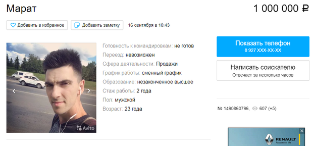 Житель Казани Марат разместил свое резюме, указав в графе профессия/должность скромное хотя и многозначительное «Марат». Марат готов принести вашей компании пользу, умеет хорошо продавать, у него хорошие навыки коммуникации плюс стрессоустойчивость с «активной и позитивной жизненной позицией». Цена его услуг — 1 млн рублей.