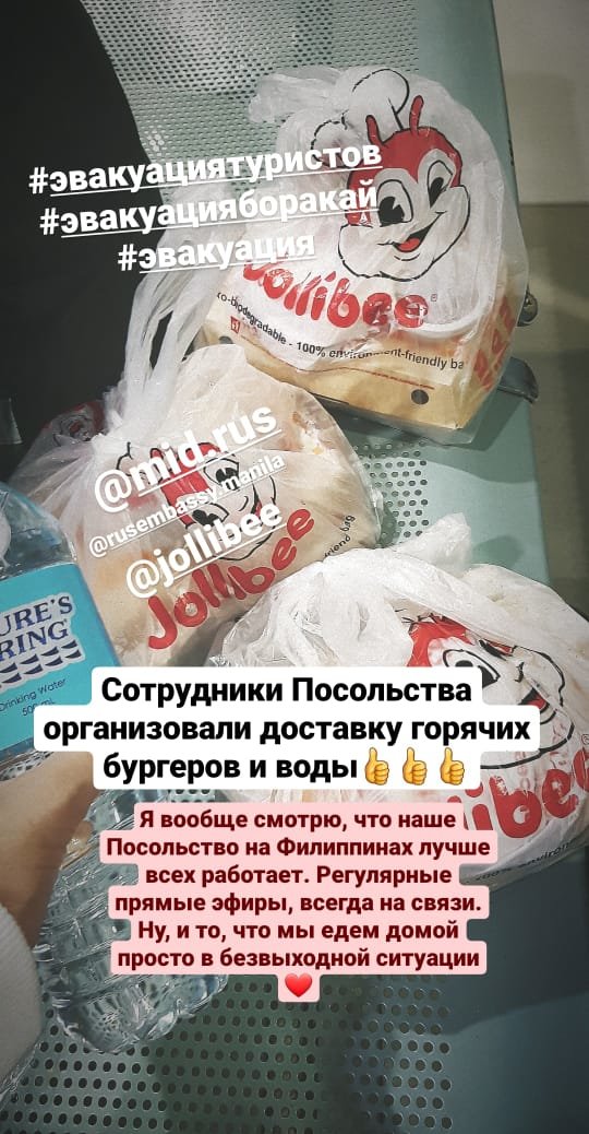 23 марта нас зарегистрировали на рейс с отправлением на 26 марта. Но на следующий день наш рейс отменили. Таким образом, у нас сгорело на этих бронях 60 тысяч рублей. И у нас осталась единственная возможность дождаться эвакуации, которую организует посольство МИД России. Они организовывают чартерные рейсы. Разумеется, не бесплатно. Туристам, улетевшим первым спецбортом с соседнего острова Себу, где скопилось около 500 российских туристов, удалось сбить цену с 500 до 100 евро с человека. По этому тарифу вывозят и нас. «Цены на транспортировку в Россию, которой займется авиакомпания «Якутия», будут такими же, как в случае с первым специальным бортом: 100 с человека, детский билет — 50», — подтвердили во время прямого эфира. В принципе, посольство работает очень хорошо. Каждый день проводят прямые эфиры с людьми, которые добавляются в группу на «Фейсбуке». И всегда рассказывают о новостях, о проделанной работе.