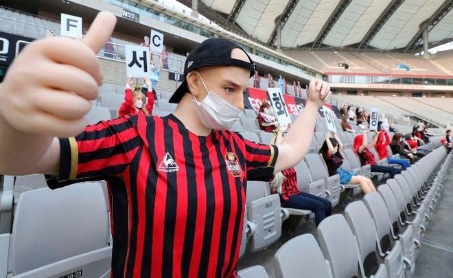 В минувшее воскресенье один из самых популярных футбольных клубов Южной Кореи «Сеул» проводил свой первый домашний матч, и на нем организаторы решили вместо болельщиков рассадить на трибунах секс-кукол (в одежде). Любопытно, что даже между ними была соблюдена безопасная дистанция, а на рты надеты маски: