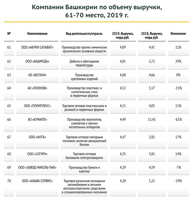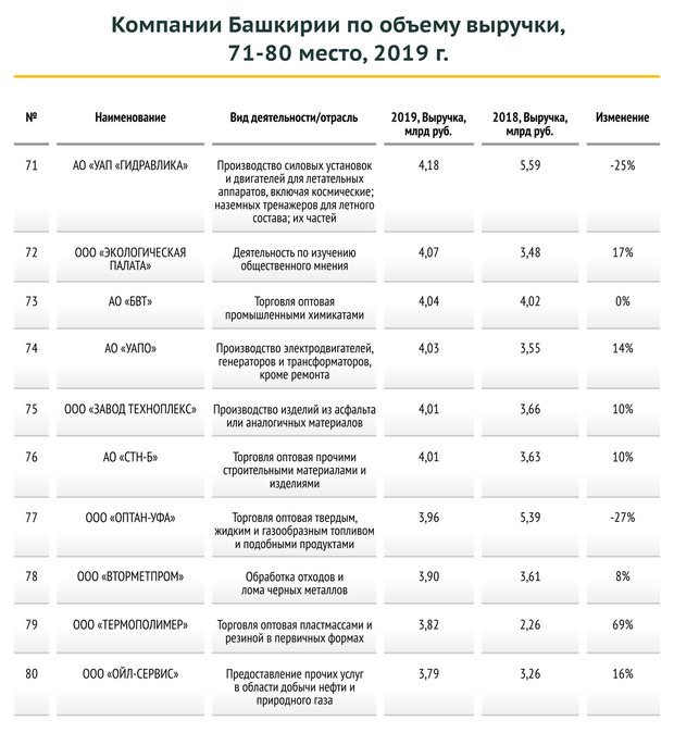 Отметим, до 2019 года экономика Башкортостана по обороту топ-100 компаний показывала ощутимый рост. Так, по результатам 2016 года их совокупный доход составлял 1,711 трлн рублей, а по итогам 2017-го — 2,062 трлн рублей. За 2018 год обороты предприятий достигли 2,521 трлн рублей. Зато 2019-й же год отметился некоторым снижением — 2,416 трлн рублей. И если в 2018 году каждый из участников рейтинга смог преодолеть рубеж в 3,4 млрд, то за год эта планка опустилась до 3 млрд рублей.