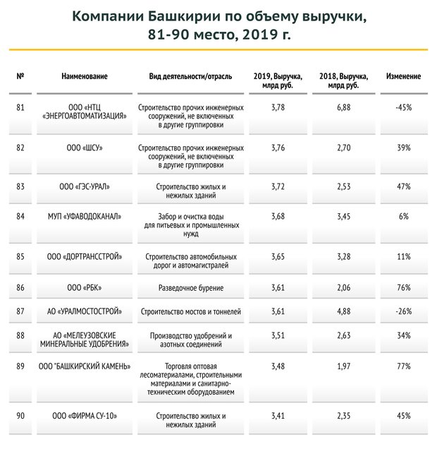 Также в топ-100 попали еще две дочерние компании — ПАО «Уфаоргсинтез» (14-е место, выручка — 29,6 млрд рублей) и ООО «Башнефть-Профи» (47-е место, 6,4 млрд рублей). Несколько «дочек» вылетели из списка, уступив место более успешным.