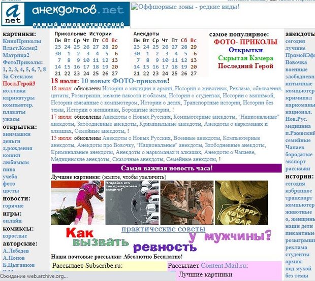 Многие известные тогда сайты поражают либо полным отсутствием нормального дизайна и удобства («юзабилити»), либо прыгающими неоновыми буквами с рекламой практических советов, как на Anekdotov.net на страничке от 19 июля: «Практические советы «Как вызвать ревность у мужчины?», и неактуальными сегодня коллажами на «Властелин колец 2» или «Матрица 2». Или почтовыми рассылками через Subscribe.ru «лучших картинок» и «лучших анекдотов» (большей частью несмешных уже тогда). Исключением можно считать разве что «Башорг», только открылся он лишь в 2004 году, став впоследствии архивом сетевого фольклора.