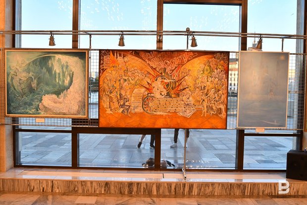 Театр имени Галиаскара Камала в новом сезоне встречает долгожданных зрителей нововведениями, продиктованными новой реальностью: у кого маски нет — ее предоставят на входе, здесь же измерят температуру. Если все в порядке — добро пожаловать в фойе. Здесь вниманию гостей представлены работы заслуженного деятеля искусств Татарстана Озада Хабибуллина. К началу сезона он подготовил новое масштабное полотно, посвященное 100-летию образования ТАССР, на котором изображены видные деятели просвещения, культуры и политики, исторически значимые личности и места республики. Как рассказал сам художник, царица Сююмбике оказалась в центре композиции не случайно — это символ красоты, несгибаемости и самобытности народа, а время ее правления — период расцвета многих сфер жизни народа.