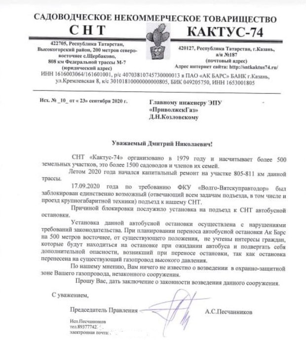Но есть важный нюанс, на который при проработке проекта почему-то не обратили внимания, но на него специалистам компании, занимающейся строительством дороги, указал Александр Песчанников: в непосредственной близости от места, где запланирована установка автобусных павильонов, а затем и строительство капитального объекта — надземного пешеходного перехода, расположен… подземный газопровод. По словам председателя правления СНТ, когда по этой территории время от времени проезжают машины — это одно. А когда сверху начнутся земляные работы по возведению большой и тяжелой капитальной конструкции, предназначенной для пешеходов, а рядом разместится павильон, где местные жители и садоводы будут вынуждены ждать автобус — совсем другое. Опасно. Об этом же он сообщил письмом в ЭПУ «ПриволжскГаз». Письмо это принято и зарегистрировано.