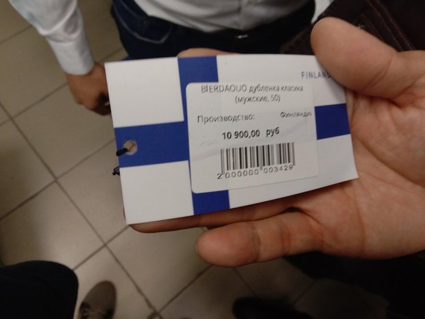 На предлагаемой куртке лишь висел прямоугольный кусок картона, оформленный в цвета финского флага. На нем было написано: «Дубленка классика. Производство: Финляндия. 10 900 руб.». Внизу напечатан штрих-код. Других данных, которые должны быть на продаваемой в России одежде, не было на картоне: ни сырья, из которого изготовлено изделие, ни способа ухода, ни контакта поставщика.