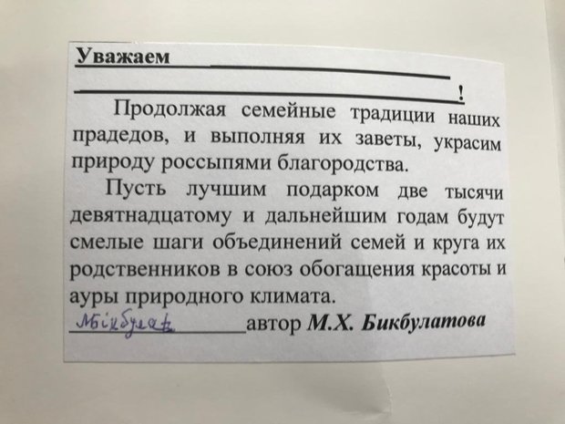 Поздравление с новым, 2019-м годом для друзей, коллег и единомышленников. Обратите внимание на автограф — буквами татарского алфавита с элементами латиницы. Фото предоставлено realnoevremya.ru из семейного архива Мамдуды Бикбулатовой
