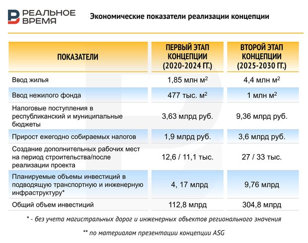 Директор по развитию территорий ASG Ринат Аисов обрисовал поэтапную процедуру подготовки земель: выбрать приоритетные направления для развития, формат освоения, утвердить дорожные карты, разработать проекты планировок территорий силами компании, включиться в федеральную программу поддержки развития инфраструктуры, начать строить сети. Как только площадки будут готовы, собственник совместно с застройщиками сможет приступить к активному освоению земель. Экономический эффект для Казанской агломерации, по его словам, будет следующим: до 2024 года создание площадок для ввода 1,85 млн кв. м жилья, ввод 477 тыс. кв. м нежилого фонда, налоговые поступления в бюджет — 3,63 млрд рублей, прирост ежегодно собираемых налогов — 1,9 млрд рублей, на период строительства создание 12 тыс. рабочих мест, создание 11 тыс. рабочих мест после реализации проекта.