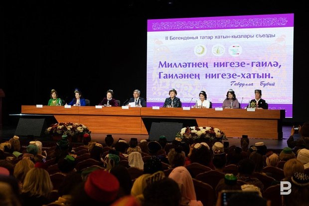 Вторая фотография — съезд татарских женщин 2017 года. Мне нравится, что они все в калфаках, нравится сам предмет — очень элегантный. Показательно, что на официальном мероприятии появляется символический предмет из народного костюма.