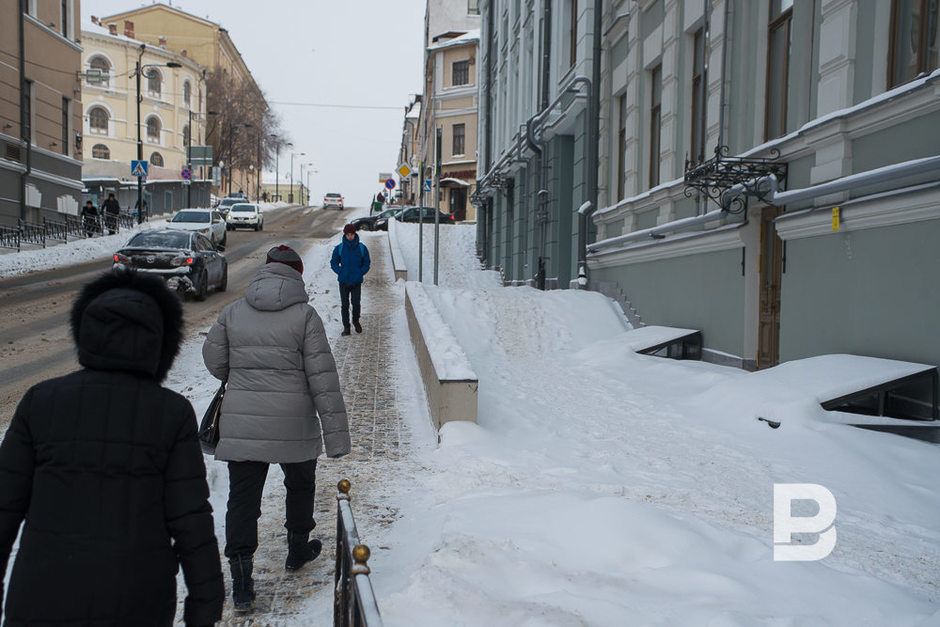 По многочисленным лестницам в столице Татарстана спускаться решительно опасно — снег превратил ранее безопасные спуски в сплошные горки.
