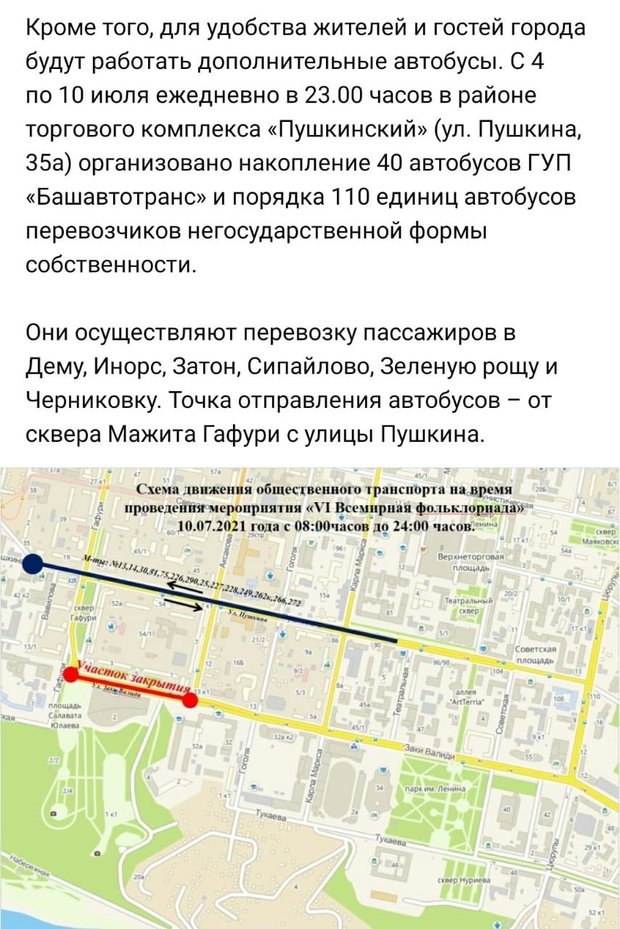 «Для удобства жителей и гостей города будут работать дополнительные автобусы. С 4 по 10 июля ежедневно в 23.00 часов в районе торгового комплекса «Пушкинский» (ул. Пушкина, 35а) организовано накопление 40 автобусов ГУП «Башавтотранс» и порядка 110 единиц автобусов перевозчиков негосударственной формы собственности. . Они осуществляют перевозку пассажиров в Дёму, Зеленую рощу и Черниковку. Точка отправления автобусов — от сквера Мажита Гафури с улицы Пушкина» (из Instagram @ufacityadm).