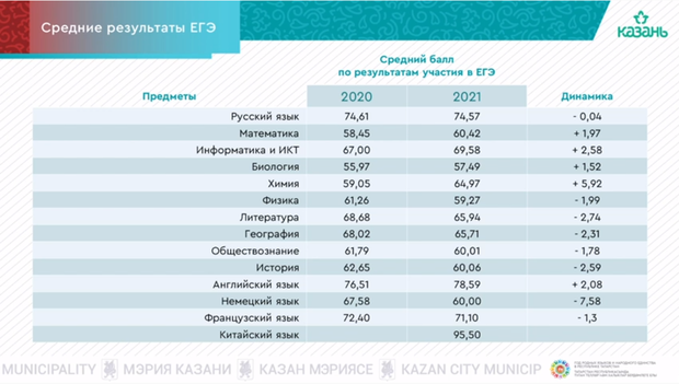 — В целом результаты наших школьников оказались выше, чем в среднем по стране. Так, казанские школьники показали средний результат выше общероссийского по русскому языку — на 3 балла, по математике — на 5 баллов. Последние годы данная тенденция сохраняется. Казанским выпускникам удалось улучшить средний балл по пяти предметам из 14. Хочется выделить рост среднего балла по химии, которую для сдачи ЕГЭ выбрал каждый восьмой казанский школьник. В этом году удалось добиться увеличения среднего балла почти на 6 пунктов. Радуют результаты и по другим предметам. В сравнении с прошлым годом средний балл по информатике, английскому языку увеличился на 2 пункта. Кроме того, в этом году выпускники впервые сдавали ЕГЭ по китайскому языку. Здесь средний балл составил 95,5, — отметил Ахметов.