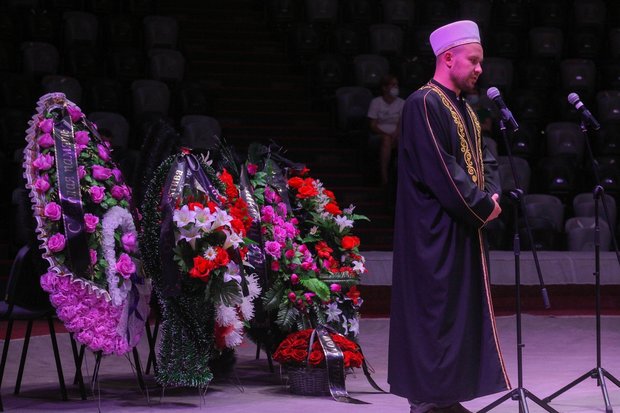Далее он прочитал короткий джаназа-намаз, после чего под аплодисменты присутствующих покойного вынесли из здания.