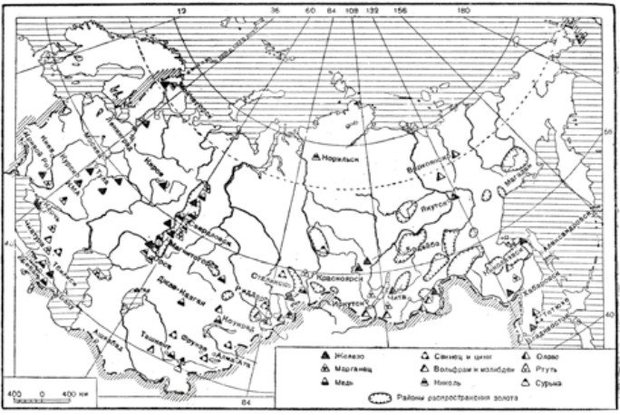 Много в СССР свинца и цинка (на Алтае, Северном Кавказе, Дальнем Востоке), никеля (на Урале), бокситов (в Ленинградской области и на Урале), вольфрама (в Бурят-Монголии) и др. Олово имеется в Забайкалье и в Якутии. В СССР богатейшие запасы золота и платины.