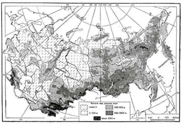 Формы поверхности СССР очень разнообразны. Здесь есть и высочайшие горы и огромные плоские низменности. Европейская часть СССР представляет собой в основном равнину, носящую название Восточно-Европейской или Великой Русской, со средней высотой в 175 м над уровнем океана. Эта равнина местами всхолмлена. На ней расположены сравнительно невысокие возвышенности — Валдайская (наивысшая точка 321 м), Приволжская (до 400 м), Литовско-Белорусская (343 м), Волыно-Подольская (407 м), Донецкий кряж (369 м) и др. На севере, в середине Кольского полуострова, находятся Хибинские горы (до 1 198 м). На юге равнину обрамляют горы Крымские (Роман-Кош — 1 543 м) и Кавказские, которые состоят из Главного Кавказского хребта (самая высокая вершина — Эльбрус — 5 633 м) и примыкающего к нему с юга нагорья Малый Кавказ (вершина Алагез — 4 095 м). В западные области Украины спускается северный склон Карпатского хребта (до 2 058 м).