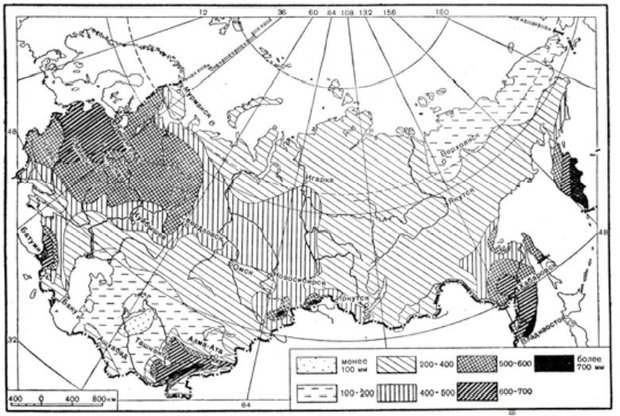 На западе европейской части СССР выпадает 500—600 мм осадков в год, т. е. климат здесь довольно влажен. По направлению к востоку, а особенно к северо-востоку и юго-востоку количество осадков уменьшается: в средней полосе Сибири до 300—500 мм, на крайнем севере Сибири — до 200 мм и менее, в Заволжье — до 200—400 мм, а в среднеазиатских пустынях — до 80 мм. В, Заволжье, в Казахстане ведется планомерная борьба с засухой. В Средней Азии и восточном Закавказье бо́льшая часть полей орошается искусственно.