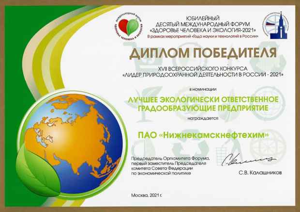 Семнадцатый конкурс «Лидер природоохранной деятельности в России — 2021» закончился триумфом для нефтехимиков. Компания представила на рассмотрение общественно-экспертной комиссии итоги экологической деятельности за последние годы и стала обладателем трех номинаций: