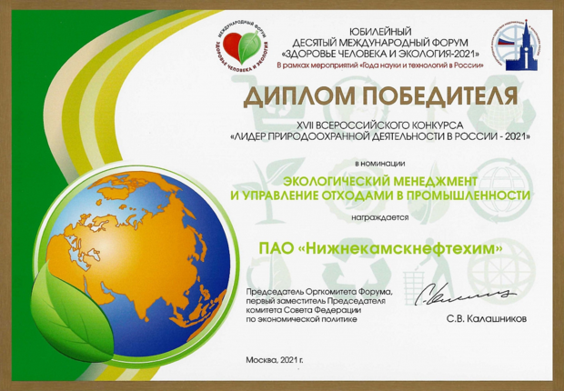 «Нижнекамскнефтехим» стал победителем XVII Всероссийского конкурса «Лидер природоохранной деятельности в России — 2021». Предприятие взяло сразу три номинации: «За экологическую ответственность», «Лучшее экологически ответственное градообразующие предприятие», «Экологический менеджмент и управление отходами в промышленности». Итоги конкурса были объявлены на юбилейном Международном форуме «Здоровье человека и экология — 2021». Обо всем подробнее — в материале «Реального времени».