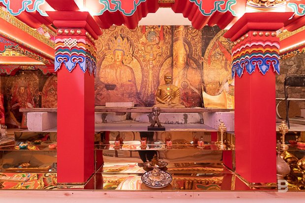 На очереди — открытие буддийского зала. Работа над ним стартовала прошлой зимой. Сейчас в нем осталось завершить отделку алтаря и, как говорит Ханов, «сделать небеса» — установить над ним деревянные балки со светильниками на потолок. Помещение получилось очень ярким и богато декорированным. Потолок украшен росписью и мозаикой, примыкающий к нему гипсовый фриз — орнаментом и нишами с золочеными фигурками Будды.