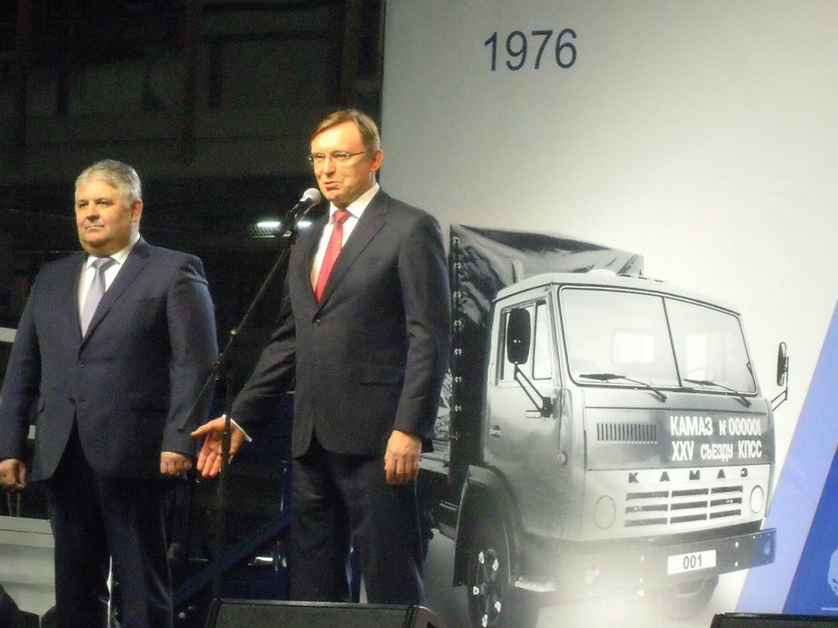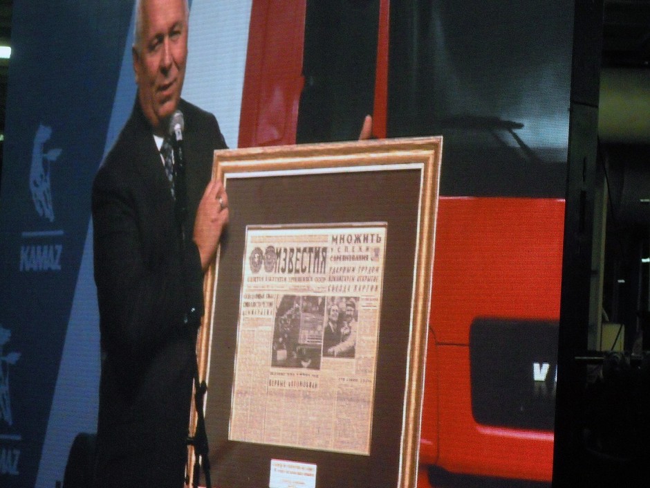 Из всех вип-выступлений, пожалуй, самые громкие овации камазовцев сорвал глава «Ростеха» (не считая Путина, конечно, полный текст его поздравления можно прочитать здесь): Чемезов, помимо официально-обычного текста поздравления, в котором он нечаянно назвал камский гигант «волжским», вызвав смех в зале, неожиданно преподнес Когогину и КАМАЗу газету «Известия» за 16 февраля 1976 года, где о первом КАМАЗе было написано на первой же полосе — доказав, что в бизнесмене живет и дух историка и «искателя архивов». Когогин, справедливости ради, тоже показал себя недурно с историко-архивной точки зрения, каким-то невероятным образом подсчитав, что из 2,173 млн грузовиков на данный момент в эксплуатации в России 854 тыс. автомобилей в строю, а с учетом машин за рубежом — по дорогам катается их более миллиона.