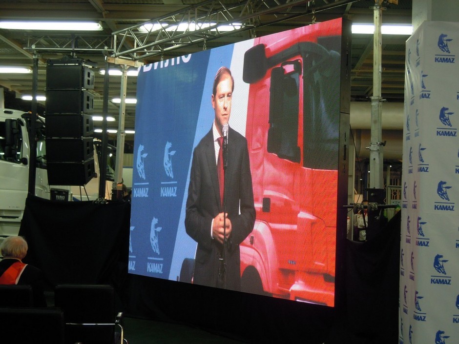 Появление Путина можно было узнать на слух: 3 тысячи заводчан встретили его аплодисментами, и сам президент РФ, услышав их, в итоге вместо того, чтобы сразу выбежать на сцену, решил «пойти в народ» и пару минут жал камазовцам руки. Вслед за ним потянулась вереница федеральных чиновников, в том числе вице-премьер РФ Дмитрий Рогозин с портфелем (он курирует оборонку и является председателем коллегии Военно-промышленной комиссии РФ) и министр обороны Сергей Шойгу. В толпе министров РФ можно было заметить и с любопытством оглядывающегося вокруг Игоря Сечина, который, впрочем, формально никакого отношения не имеет ни к КАМАЗу, ни к ВПК (неформально, понятное дело — ключевой соратник Путина).