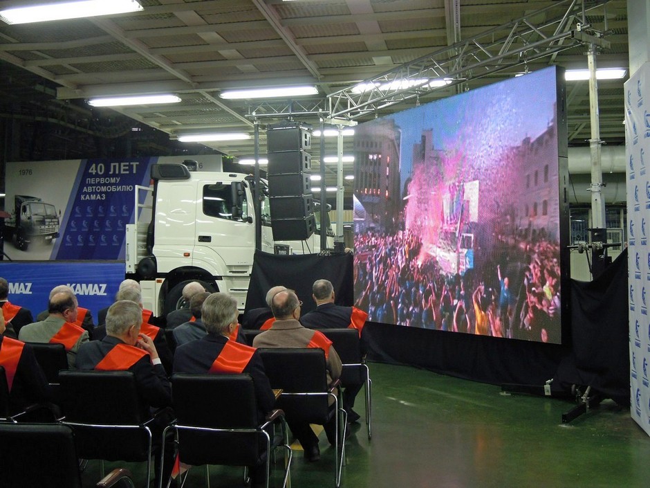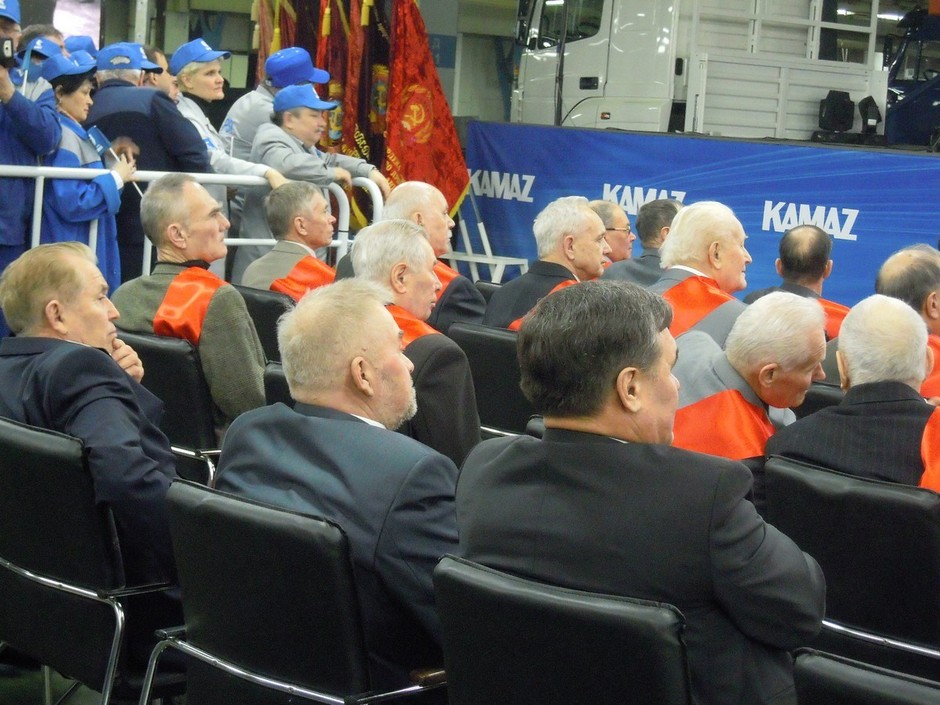У сцены стоял тот самый (во всяком случае формально представляющий тот самый) грузовик, который в 1976 году первым сошел с конвейера: «КАМАЗ №000001 XXV съезду КПСС». Для сравнения рядом поставили КАМАЗ не КПСС-овский, кабина которого была в полтора раза огромнее и, в отличие от красного 40-летнего дедули, белого цвета. Большинство камазовцев стояли с фирменными флажками и в синих кепках. Перед сценой посадили около двадцати ветеранов автогиганта, 40 лет назад работавших над производством первого КАМАЗа, с алыми подвязками и орденами. На двух табло транслировали старую черно-белую советскую хронику.