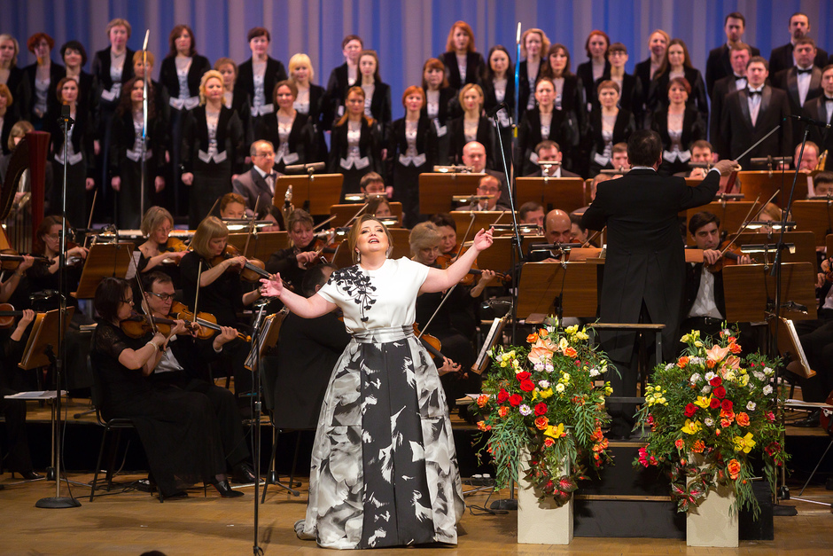 Авансцена убрана цветами, у порталов сцены горят канделябры, люстры на фоне воздушного задника приспущены. Оркестр разместился на сцене. Концерт начинает Альбина Шагимуратова — гладкая прическа, изящный макияж, не совсем привычный сценический костюм: на певице черно-белая юбка со шлейфом и белая блузка. Все строго, элегантно, очень женственно.