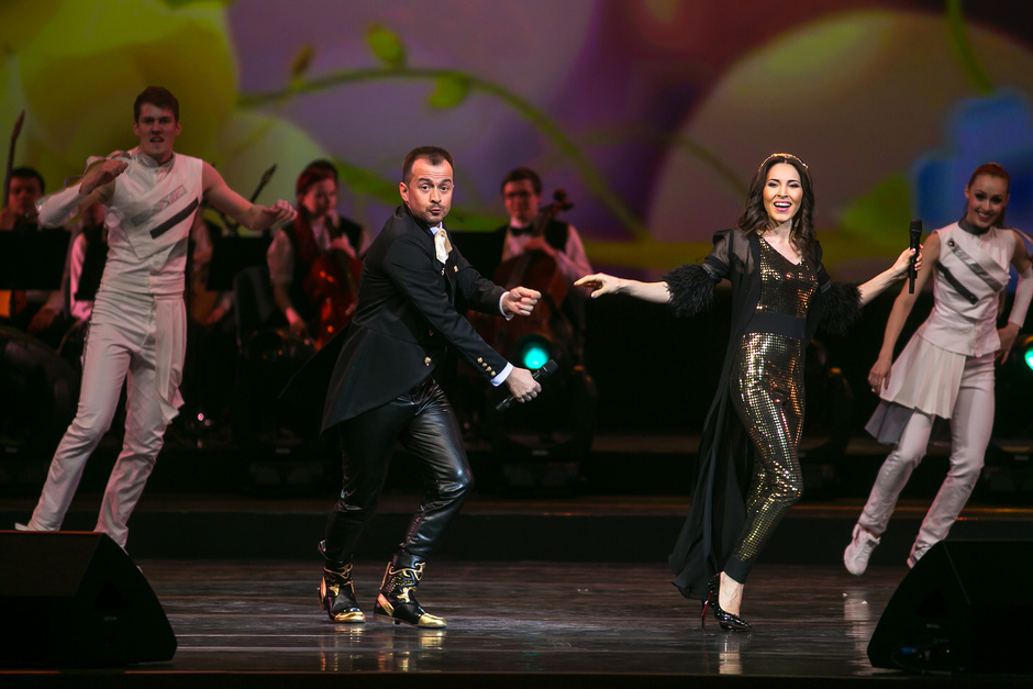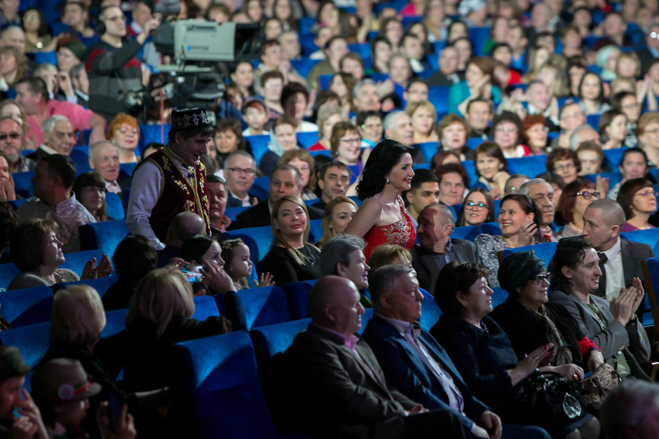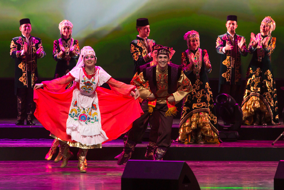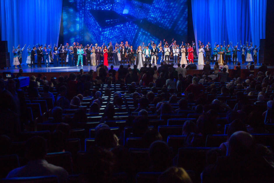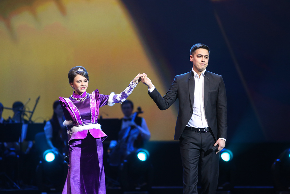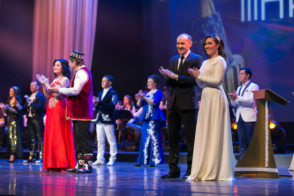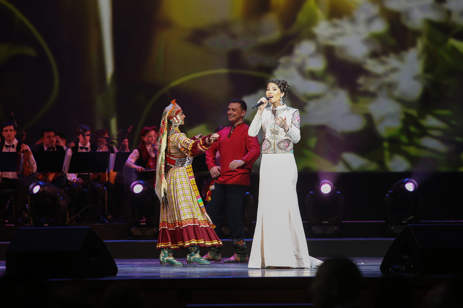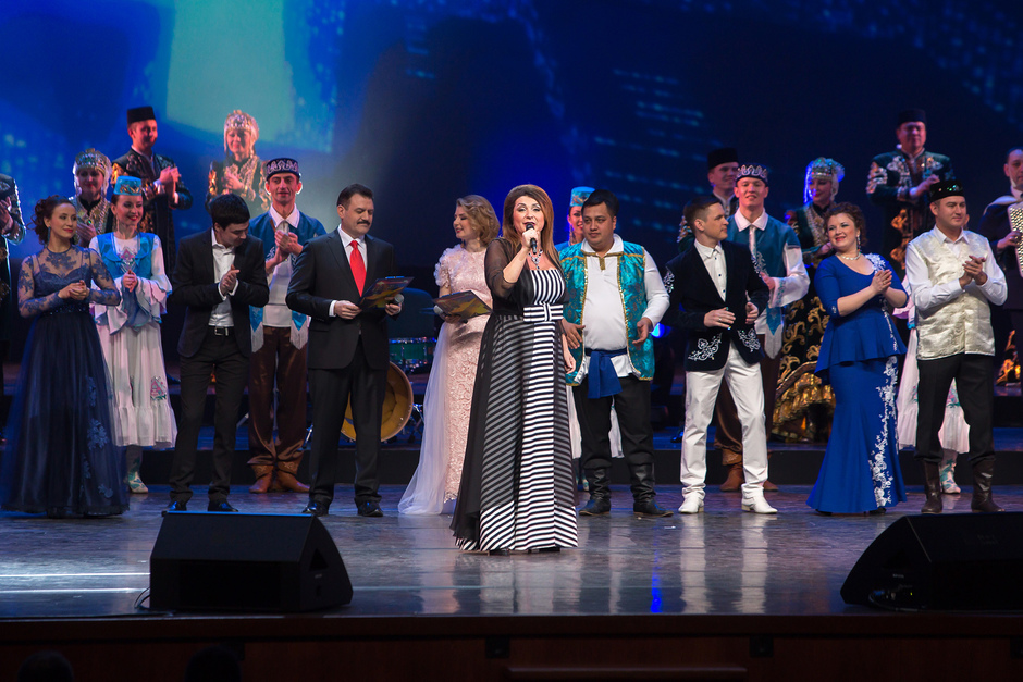 Остальные артисты поднялись на сцену прямо из зала, где их уже ждали ведущие канала ТНВ Венера Иванова и Ильдар Киямов. Всего вместе с хором Tatarica и членами танцевальных ансамблей участие приняли почти 300 артистов.