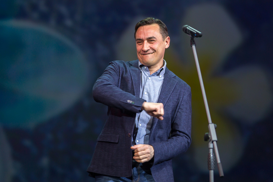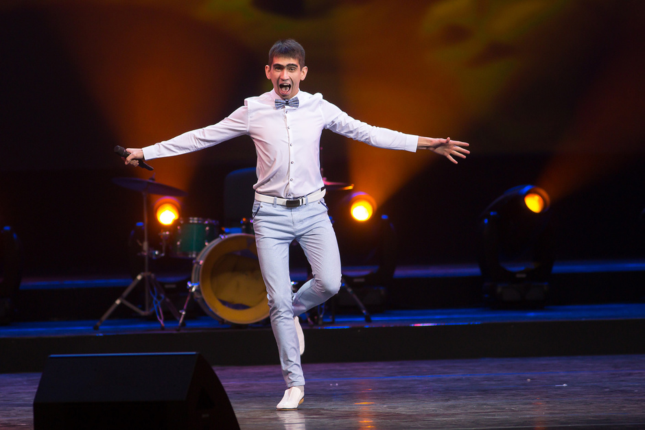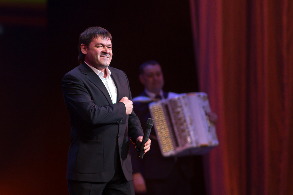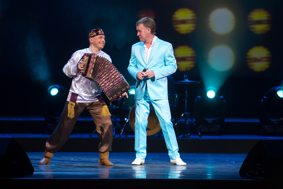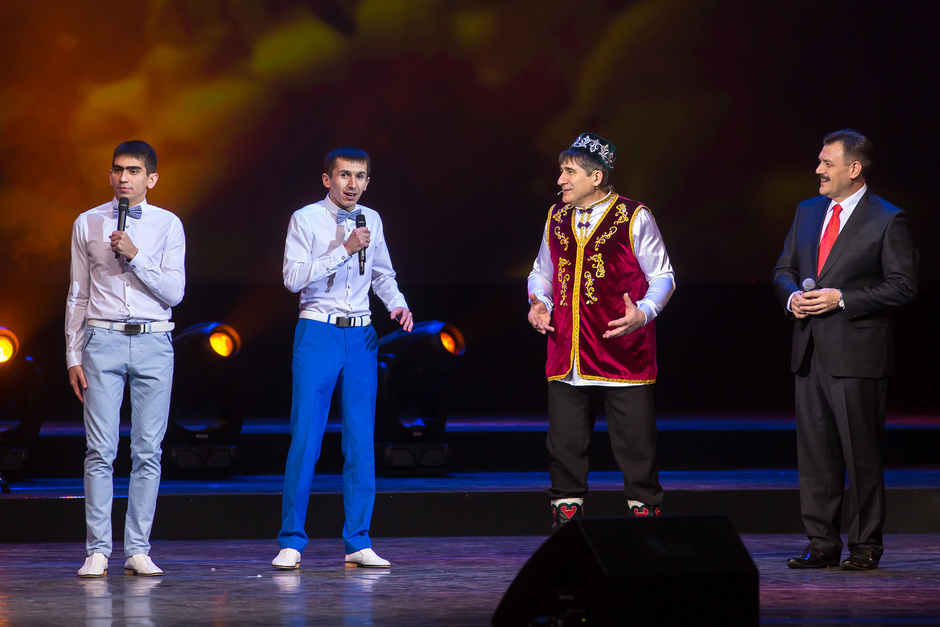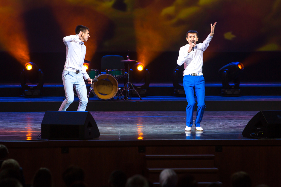 А минутку юмора после антракта провели Рифат Зарипов и Рамиль Шарапов. Они устроили пародийный баттл между двумя известными певцами-мишарами Ринатом Рахматуллиным и Фирдусом Тямаевым, весело подпрыгивая и танцуя так же, как делают на сцене эти исполнители. «Зритель любит, когда артист и поет, и танцует, поэтому мы называем себя «кофе три в одном». В то же время люди ждут разножанровый юмор. Например, нужен пародийный юмор, пантомимы. Сейчас к этому нужно относиться креативно, только от разговорного юмора народ устает. На татарской эстраде мало пантомим, я сам хочу освоить жанр клоунады», — рассказал за кулисами корреспонденту «Реального времени» Рамиль Шарапов.