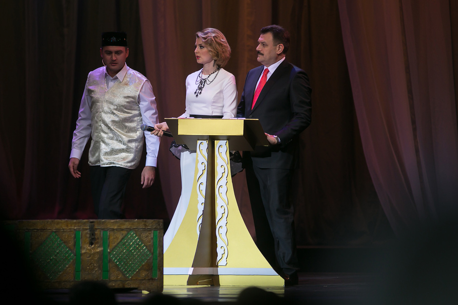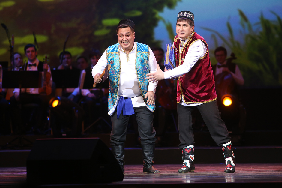 Конечно, если бы на сцене Кремлевского дворца, где в свое время проводились партийные съезды, конферансье начал с одной и той же интонацией объявлять все номера, концерт получился бы очень претенциозным. Но номенклатурность нынче не в моде, поэтому на помощь ведущим пришел Шомбай из театра «Мунча ташы» (что-то среднее между «Городком» и «Аншлагом»), он же народный артист РТ Джавит Шакиров. «Давным-давно, когда Минтимер Шарипович еще не был президентом, жил-был парень», — начал свою сказку веселый бабай, и перед каждым выступлением он доставал из сундука новую историю. Но оказалось, что его сказки сильно отличаются от тех, что мы привыкли слышать в детстве. Получив современное звучание, они вызывали улыбку и в то же время заставляли грустить.