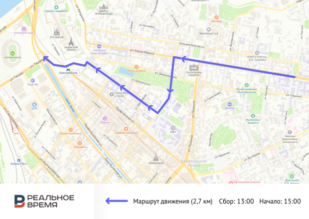 - В Казани спустя два года Всероссийская акция «Бессмертный полк» вновь состоится в очном формате. Она начнется 9 мая в 15.00. Сбор участников стартует в 13.00 на пересечении улиц Карла Маркса и Толстого. Шествие пройдет по улицам Карла Маркса, Лобачевского, мимо парка «Черное озеро» и по улице Кремлевской. Завершится акция на площади Тысячелетия, где будет проходить концерт.