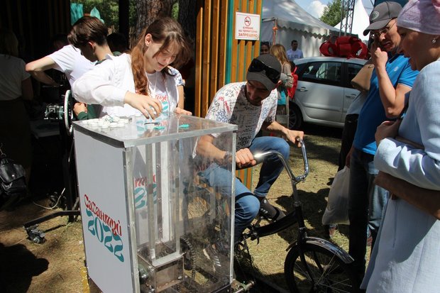 Всем гостям праздника предоставлялась возможность принять участие в экологической акции. На майдане был установлен велошредер, каждый мог крутить педали этой установки и таким образом измельчать пластиковые крышки от бутылок, а потом на специальном оборудовании сделать из полученной крошки брелок. Таким образом, каждый мог убедиться не на словах, а на деле, что значит дать вторую жизнь пластиковым бутылкам.