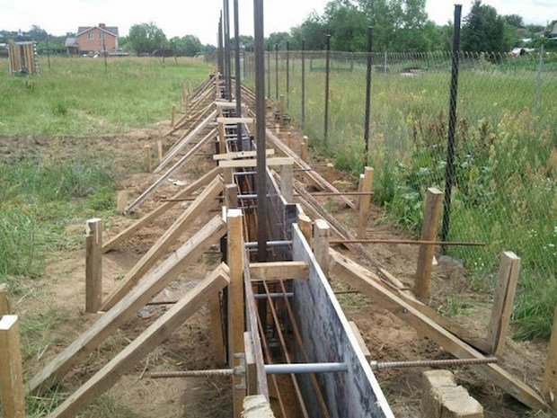 А вот если под забор заливается ленточный фундамент — вот тогда столбы бетонируются, потому что армированная лента свяжет опоры между собой. Такая технология применяется, если, например, забор планируется кирпичный или каменный. Опоры у такого ограждения все равно будут металлическими, а сам забор будет выложен на армированной железобетонной «ленточке».