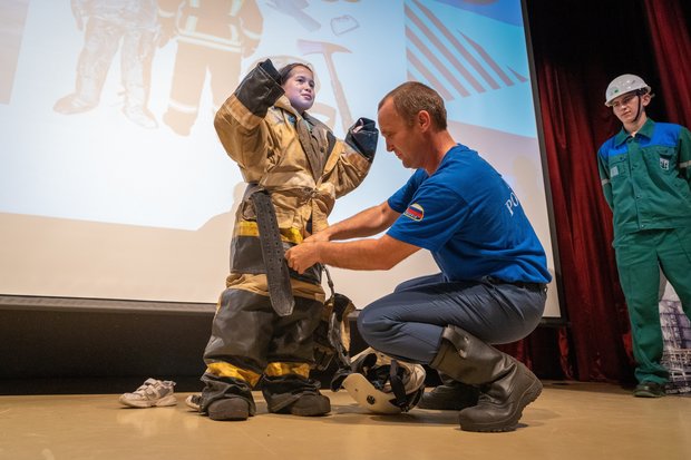 До начала мероприятия сотрудники противопожарной службы также продемонстрировали ребятам аварийно-спасательное оборудование: рукава, пожарные стволы, бензорез. Большой интерес у детей и вожатых лагеря вызвала боевая одежда пожарного, которую чуть позже ребята смогли примерить во время интерактивных игр.
