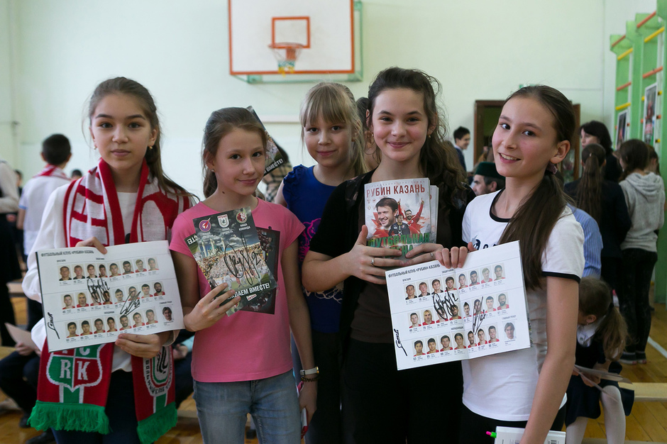 Накануне рядовой урок «физры» превратился для учащихся седьмого «Б» класса казанской гимназии номер 27 в настоящий праздник. Ребята заняли 4-е место в конкурсе «Самый футбольный класс» и приняли «на своем» поле казанский «Рубин» в лице капитана команды Олега Кузьмина в компании с Магомедом Оздоевым и тренером по физподготовке «Рубина» Микелем Гомилой. Логично, ведь урок-то физкультурный.
