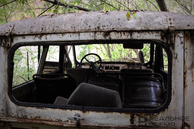 Машина, судя по всему, оказалась в этом месте, когда территория не была такой заросшей и во двор можно было спокойно заехать. Сейчас же, чтобы вытащить этот УАЗик, понадобится расчищать площадку и срубать деревья. Также отметим, что на этой территории уже побывали «искатели приключений», которые выдернули из автомобиля все ценные детали. И, судя по пленке, засыпанной стеклом внутри салона, для этого им пришлось выбивать окна.