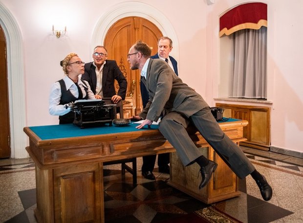 Спектакль идет в трех ракурсах. Дело происходит в фойе театра. Зрители расположены вдоль стены с окнами (главный фронтон здания по ул. Островского, окна на время спектакля закрыты). Пространство напротив них — главная сцена. А по бокам еще — две арки с нишами открывающихся пространств (справа и слева), как бы боковые сцены. Вот, допрос был от зрителей в правой стороне... Там же раньше еще происходила сцена в редакции детского журнала «Чиж». К ним пришел проверяющий номенклатурный дядька (тот самый, который в сцене допроса будет уже «гражданином следователем»), а здесь, не замечая его, носятся мимо машинистки-наборщицы, как дети малые, два взрослых дяденьки в костюмах советского покроя — Олейников (артист Евгений Быльнов) и Шварц (Мосейко).