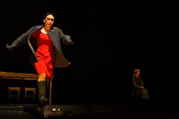 У Заббарова спектакль начинается с инсценировки рассказа «Бер генә сәгатькә» («Лишь на один час») о солдате, который ненадолго смог зайти к родным, поскольку поезд, следовавший на фронт, остановился неподалеку от деревни. Увидел отца, мать, сестру, но не смог дождаться любимую девушку. Ее играет актриса Рашида (Гузель Шакирова), которая почти всю сцену бежит по велодорожке и цитирует роскошную прозу Еники. Это очень эмоциональная часть постановки, даже не обращаешь внимания, что и прозаические фрагменты внушительны, и поставлено все очень просто. Есть драма, есть сопереживание. Еники — из тех, кто простые сюжеты превращает в игры разума и торжество литературного языка. Просто разложить его на элементы фабулы не получится. Но вот «внутренний» спектакль закончился, актеры вышли на поклон — и «закадрового» текста становится меньше, становится меньше Еники.