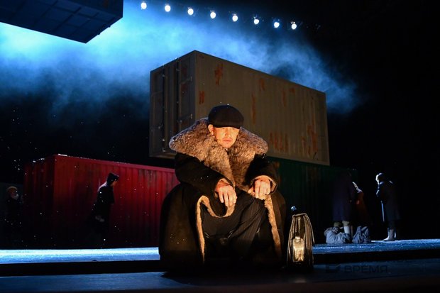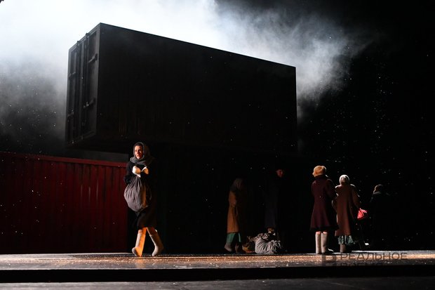 Мы еще не говорили, что спектакль длится 3,5 часа? Столько же, сколько и «Муть. Мухаджиры» Фарида Бикчантаева. Тоже инсценировка, но заполненная интересными этюдными решениями, хореографией. У Заббарова актеры в буквальном смысле играют: говорят текст и выполняют заданные действия. Сцена сменятся, когда крутится круг, на котором стоят контейнеры. Они нужны, чтобы из них иногда перетаскивали товары по новым накладным — так пунктирно изображаются аферы Зуфара, в повести подробно расписанные. Также это иногда аллюзии на жилища. Очень конкретные декорации. Очень конкретный спектакль.