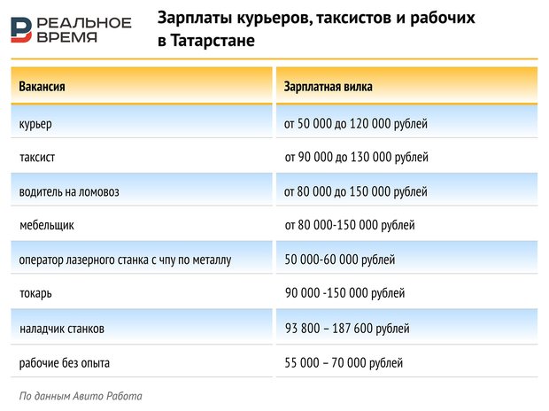 В целом рабочий без опыта может рассчитывать в Татарстане на зарплату в диапазоне от 55 тысяч до 70 тысяч рублей, а высококвалифицированный токарь — на 90—150 тысяч рублей. Для сравнения: курьеры могут заработать от 50 тысяч до 120 тысяч рублей.