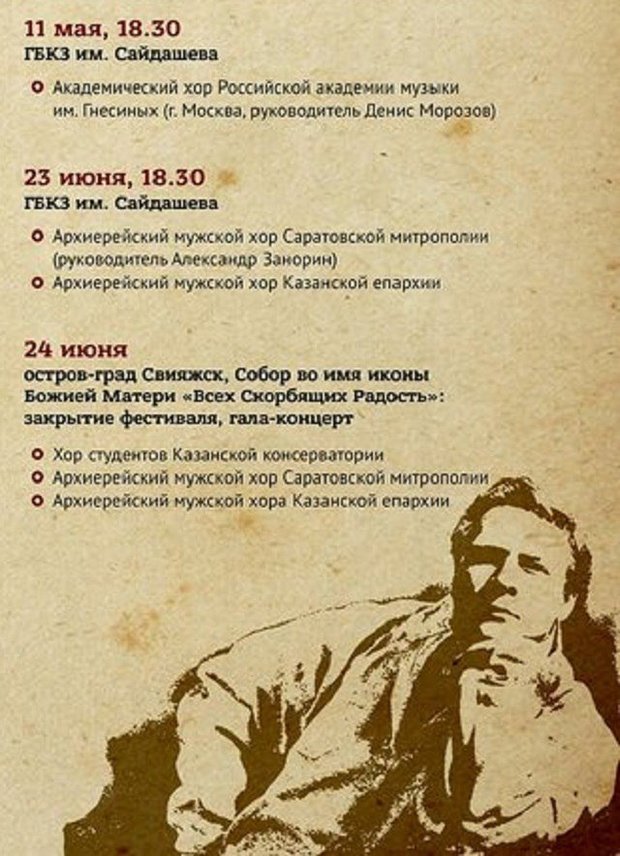 Впереди — заключительные аккорды, которые обещают быть громкими и торжественными. Хор Российской академии музыки имени Гнесиных приедет с большой программой 11 мая. В июне в гости в Казани ждут хор Саратовской митрополии. Завершится все в Свияжске — в атмосфере «острова-Буяна», в стенах старинного собора участники сводного концерта отдадут дань нашему великому земляку. И каждый вспомнит: Федор Шаляпин открыл для себя красоту музыки именно в церкви. И именно в Казани маленький певчий, мальчишка из бедного квартала, вырос в великого деятеля русской музыкальной культуры.