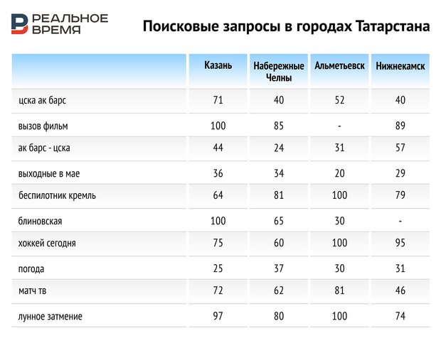 Матч «Ак Барса» с ЦСКА больше всего интересовал казанцев, что вполне логично, так как команда представляет столицу Татарстана. Любителей нового кино также оказалось больше в Казани. А вот в Альметьевске же, наоборот, никто не интересуется фильмами. Однако происшествие с беспилотниками оказалось в нефтяной столице самой волнующей и популярной темой. Для сравнения: в Казани атакой беспилотников на Кремль интересовалось меньше всего людей (64 балла), а в Набережных Челнах и Нижнекамске значение запросов оказалось практически равным (81 и 79 соответственно). Что касается последнего, то дело Блиновской вообще не интересовало нижнекамцев (0 баллов), чего не скажешь о казанцах (100 баллов).